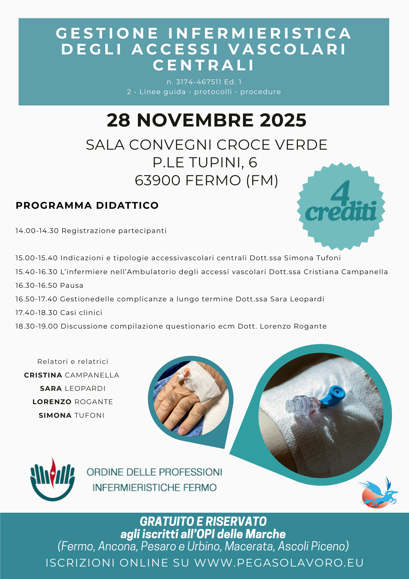QUESTO CORSO INTENSIVO DI 4 ORE È PENSATO PER FORNIRE AGLI INFERMIERI CHE OPERANO NEI VARI CONTESTI CLINI-CI UNA FORMAZIONE AGGIORNATA E PRATICA SULLA GESTIONE SICURA, EFFICACE E BASATA SULLE EVIDENZE DEGLI ACCESSI VENOSI CENTRALI. ATTRAVERSO L'ANALISI DI LINEE GUIDA INTERNAZIONALI, CASI CLINICI E BUONE PRATICHE, VERRANNO APPROFONDITI GLI ASPETTI ESSENZIALI PER GARANTIRE UN’ASSISTENZA DI QUALITÀ, RIDURRE I RISCHI E MI-GLIORARE L’OUTCOME DEL PAZIENTE.