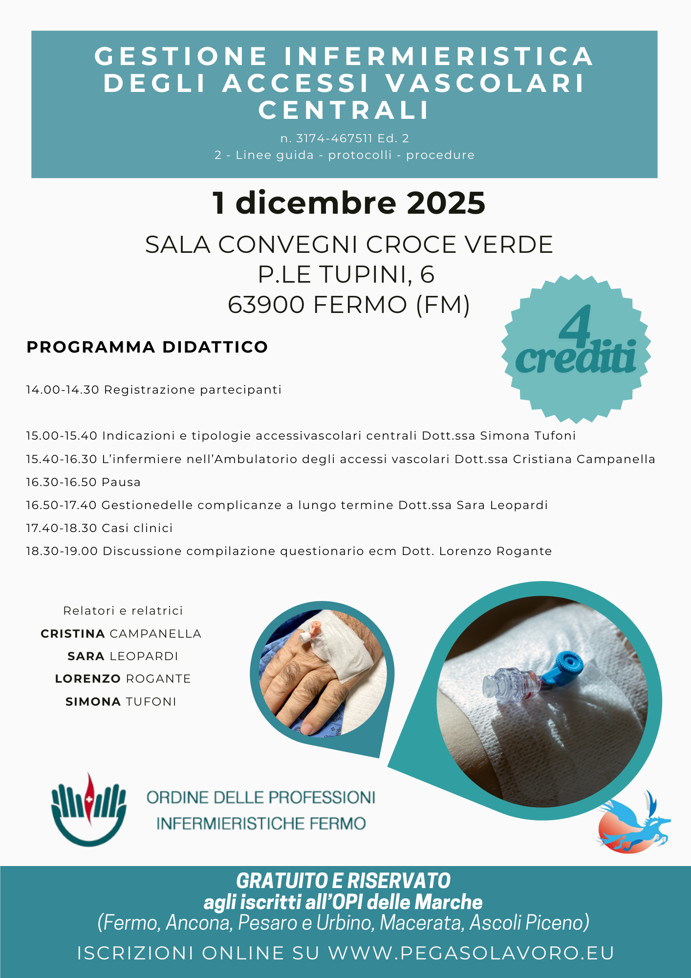 QUESTO CORSO INTENSIVO DI 4 ORE È PENSATO PER FORNIRE AGLI INFERMIERI CHE OPERANO NEI VARI CONTESTI CLINI-CI UNA FORMAZIONE AGGIORNATA E PRATICA SULLA GESTIONE SICURA, EFFICACE E BASATA SULLE EVIDENZE DEGLI ACCESSI VENOSI CENTRALI. ATTRAVERSO L'ANALISI DI LINEE GUIDA INTERNAZIONALI, CASI CLINICI E BUONE PRATICHE, VERRANNO APPROFONDITI GLI ASPETTI ESSENZIALI PER GARANTIRE UN’ASSISTENZA DI QUALITÀ, RIDURRE I RISCHI E MI-GLIORARE L’OUTCOME DEL PAZIENTE.