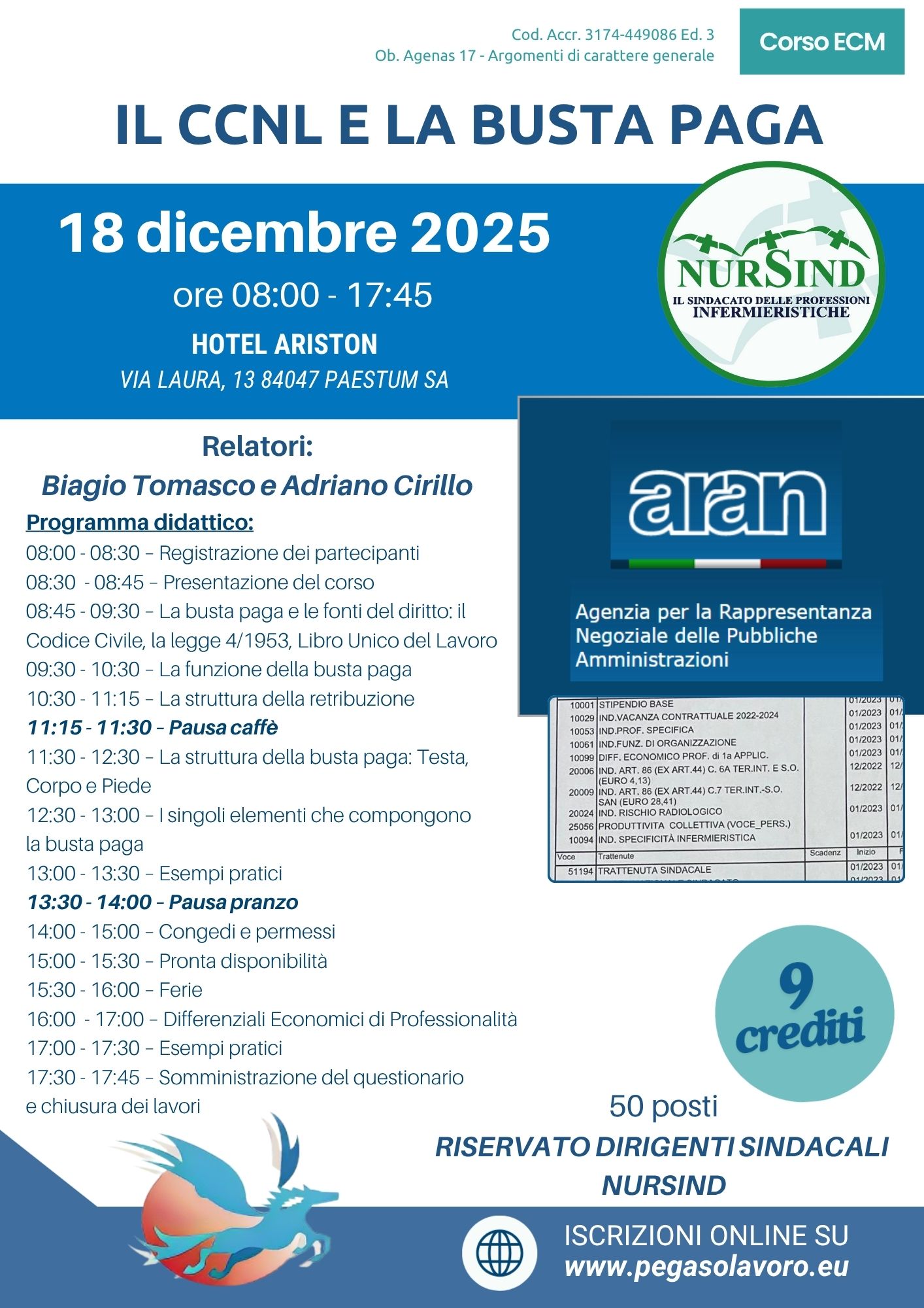 Il corso si propone di far conoscere le fonti normative e fornire gli elementi essenziali, per leggere la busta paga e saper individuare le sue componenti principali, fisse o variabili. Il corso si propone di far acquisire e implementare le conoscenze dei professionisti sanitari in merito alle nuove normative contrattuali e leggi finanziarie.