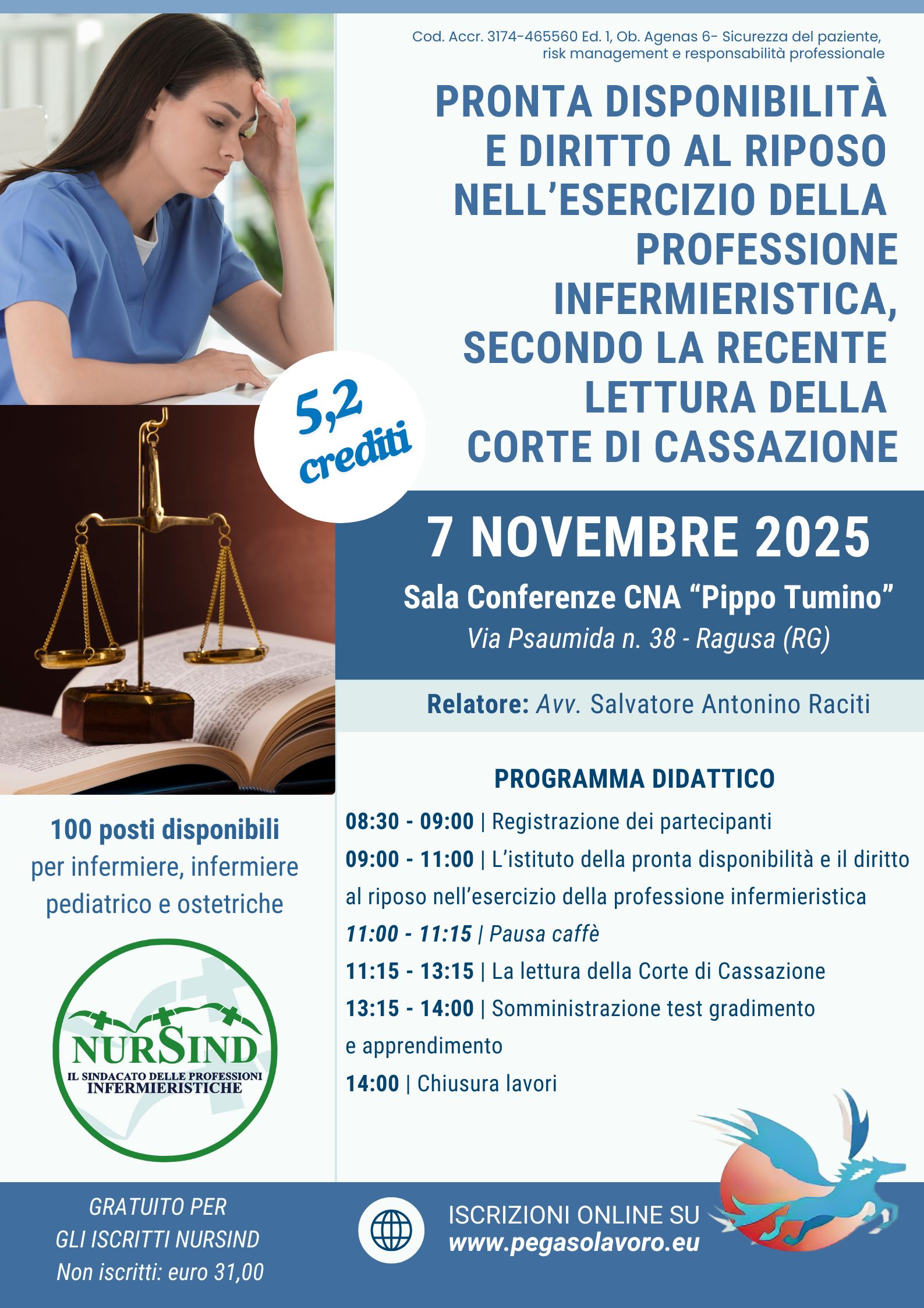 ore 09.00-11.00: L’istituto della pronta disponibilità e il diritto al riposo nell’esercizio della professione infermieristica (Avv. Salvatore Antonino Raciti);