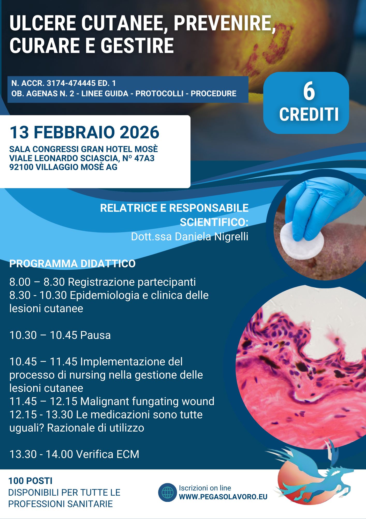 Il corso dal titolo: "Ulcere Cutanee: prevenire, curare, gestire" si pone l’obiettivo di fornire agli operatori sanitari gli strumenti formativi e decisionali validi nell’ambito della vulnologia. Secondo i dati istat la vita media in Italia è pari a 79,4 anni per gli uomini e 84,5 per le donne dunque vi è un aumento dell’aspettativa di vita ma anche un aumento delle patologie croniche. Ad oggi, a causa del decorso cronico correlato all’insorgenza di svariate patologie croniche, vi è un aumento della prevalenza delle lesioni cutanee pertanto un Percorso Diagnostico Terapeutico Assistenziale (PDTA) risulta strumento indispensabile al fine di garantire una corretta “gestione” del Paziente.